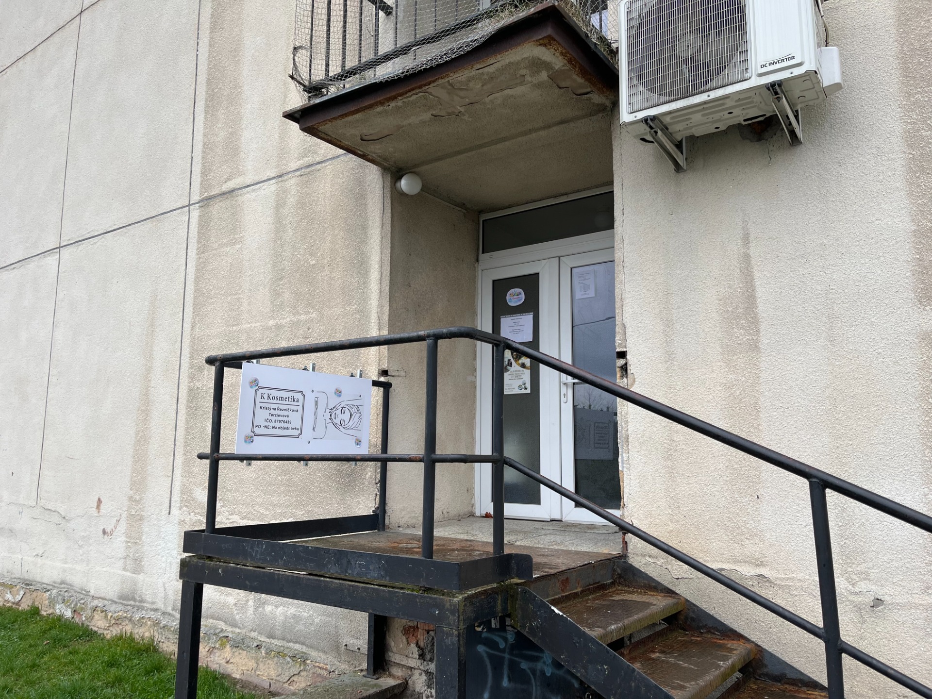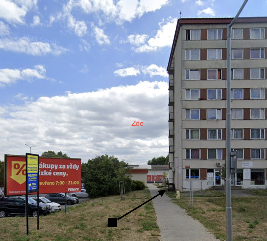 Boční vchod panelového domu (od Penny marketu), po kovovém schodišti.